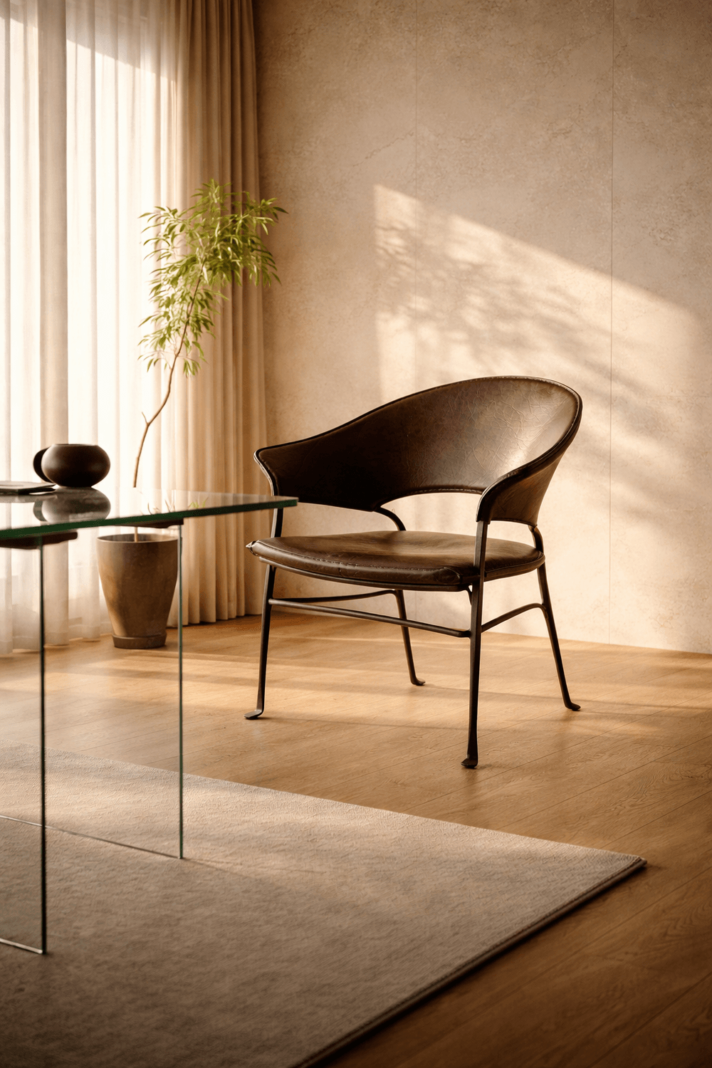 Beyond its craftsmanship, the chair conveys quiet strength and stability. The iron frame feels solid, while the taut leather seat offers firm, supportive comfort—structured yet easy to settle into. Its sculptural form is understated, durable, and confidently refined.