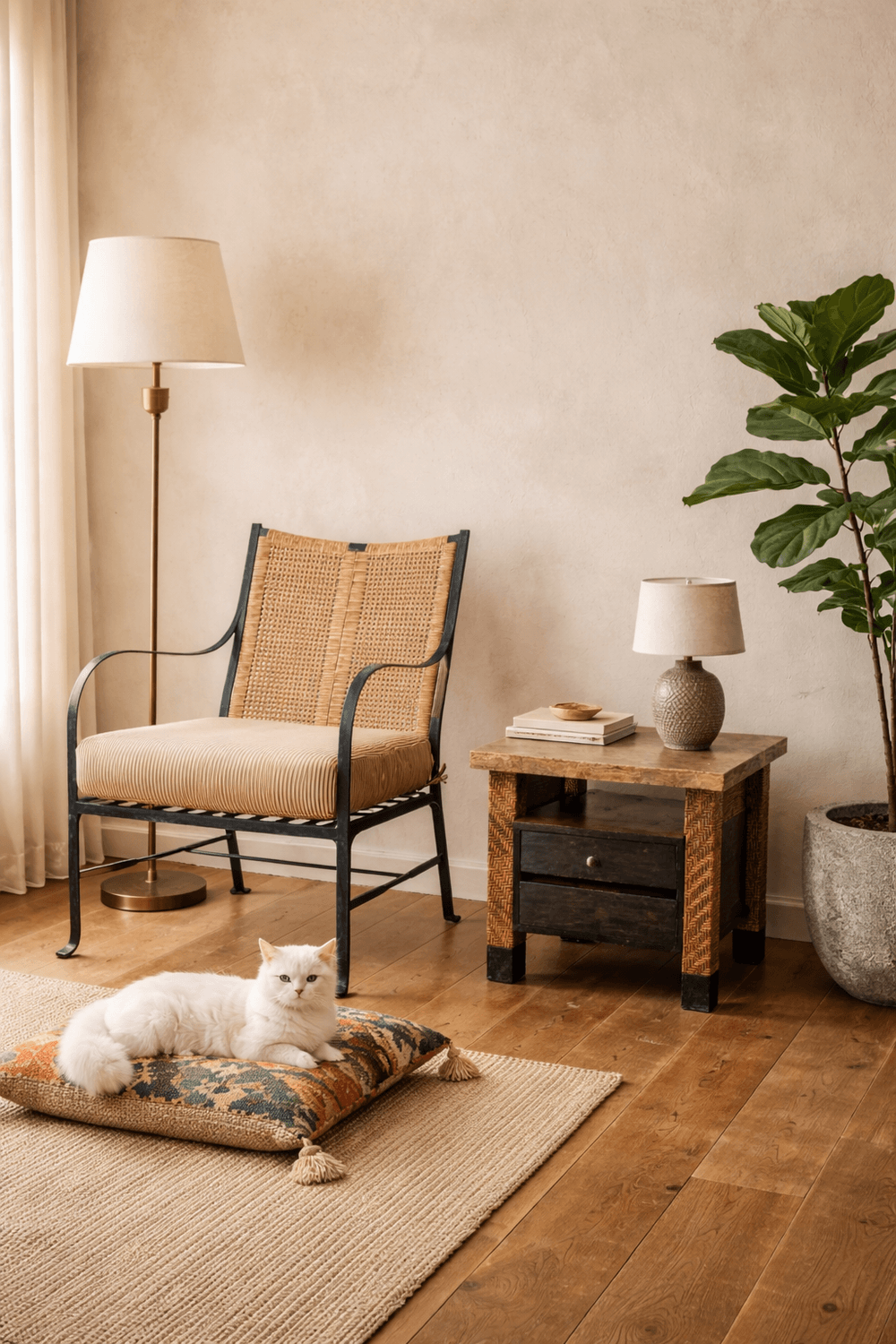 A refined expression of craftsmanship, the Nouvelle Lounge Chair pairs hand-forged iron with intricately woven rattan, achieving a balance of strength and lightness. Its cushioned seat adds a layer of comfort, making it an inviting place to unwind with a favorite book—where form meets quiet relaxation.