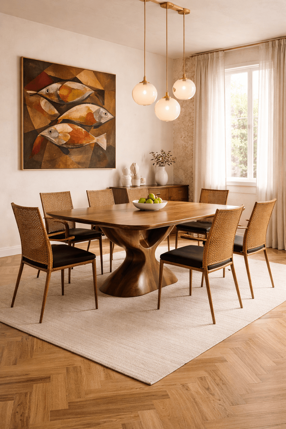 The collection spans a range of chairs, hanging mirrors, a sideboard, and tables—each piece unified by meticulous craftsmanship and distinctive design.
